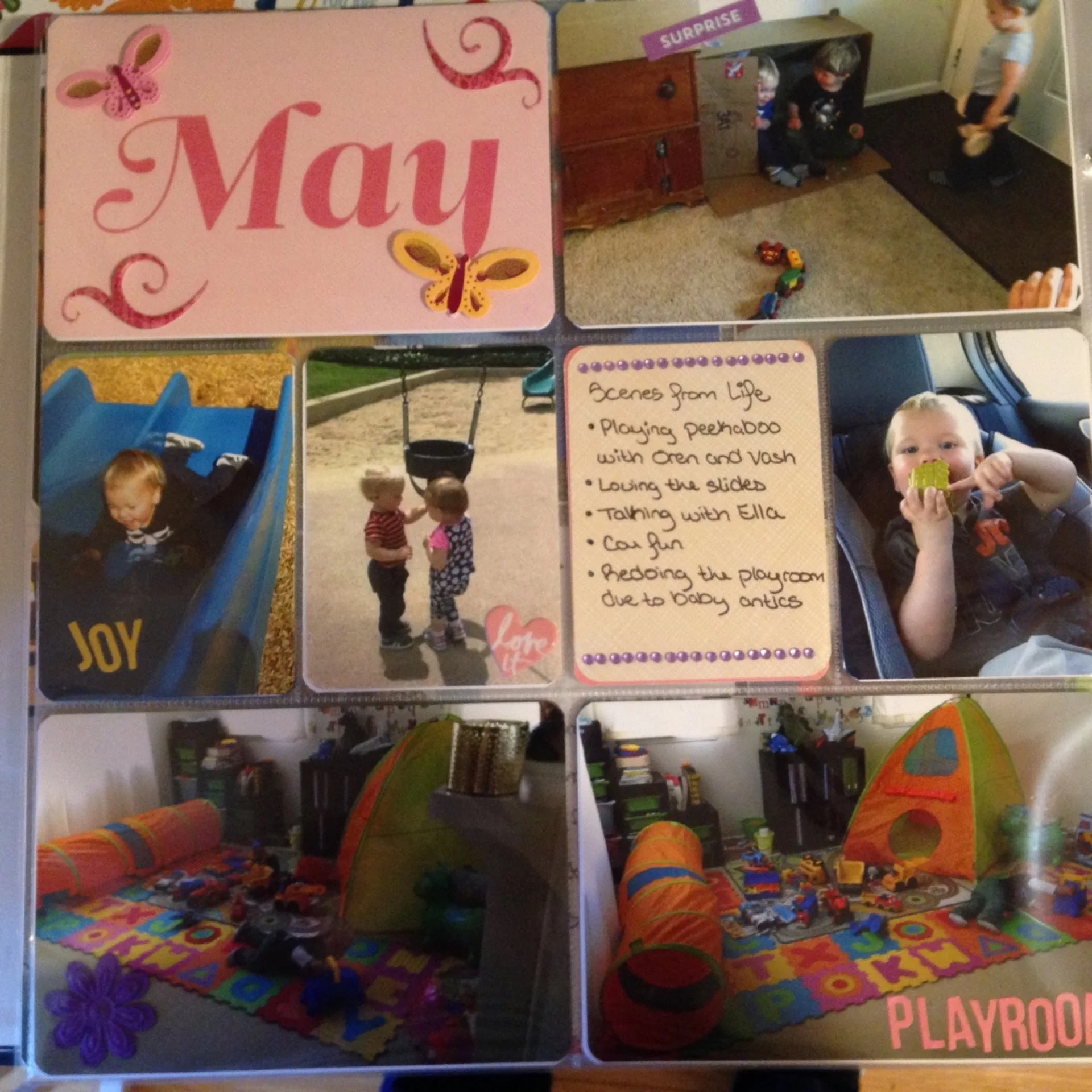 Page two highlights our monthly visit to CDM. I finally found a place for the homemade card from our butterfly swap. I added some alphas and it worked perfectly.