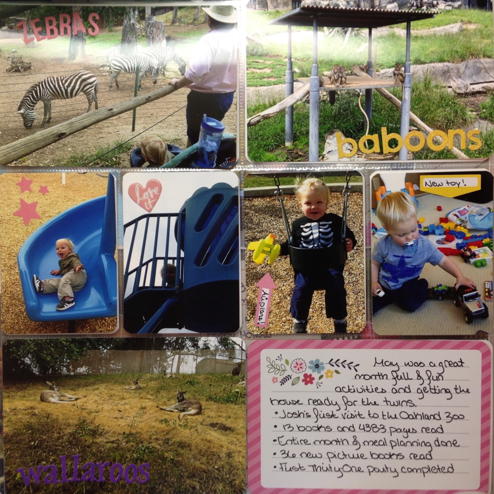 Page seven has was another hodge-podge of pictures. I highlighted a few good pics of animals from our Oakland Zoo visit. I also did a journaling card of my May wrap-up. Simple but sweet.