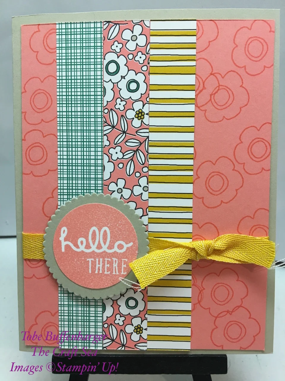 Today’s card is being featured on Stylin’ Stampin’ Inkspiration. The challenge was to create a card using one of the new product suites. For preorder, I had to have the Pieces and Patterns Stamp Set, Pick a Pattern DSP, and matching Crushed Curry Ribbon. This card is a fun take on pattern play that so trendy right now! A simple design of strips of DSP over a stamped background. I finished off the card with a great sentiment and fun ribbon.