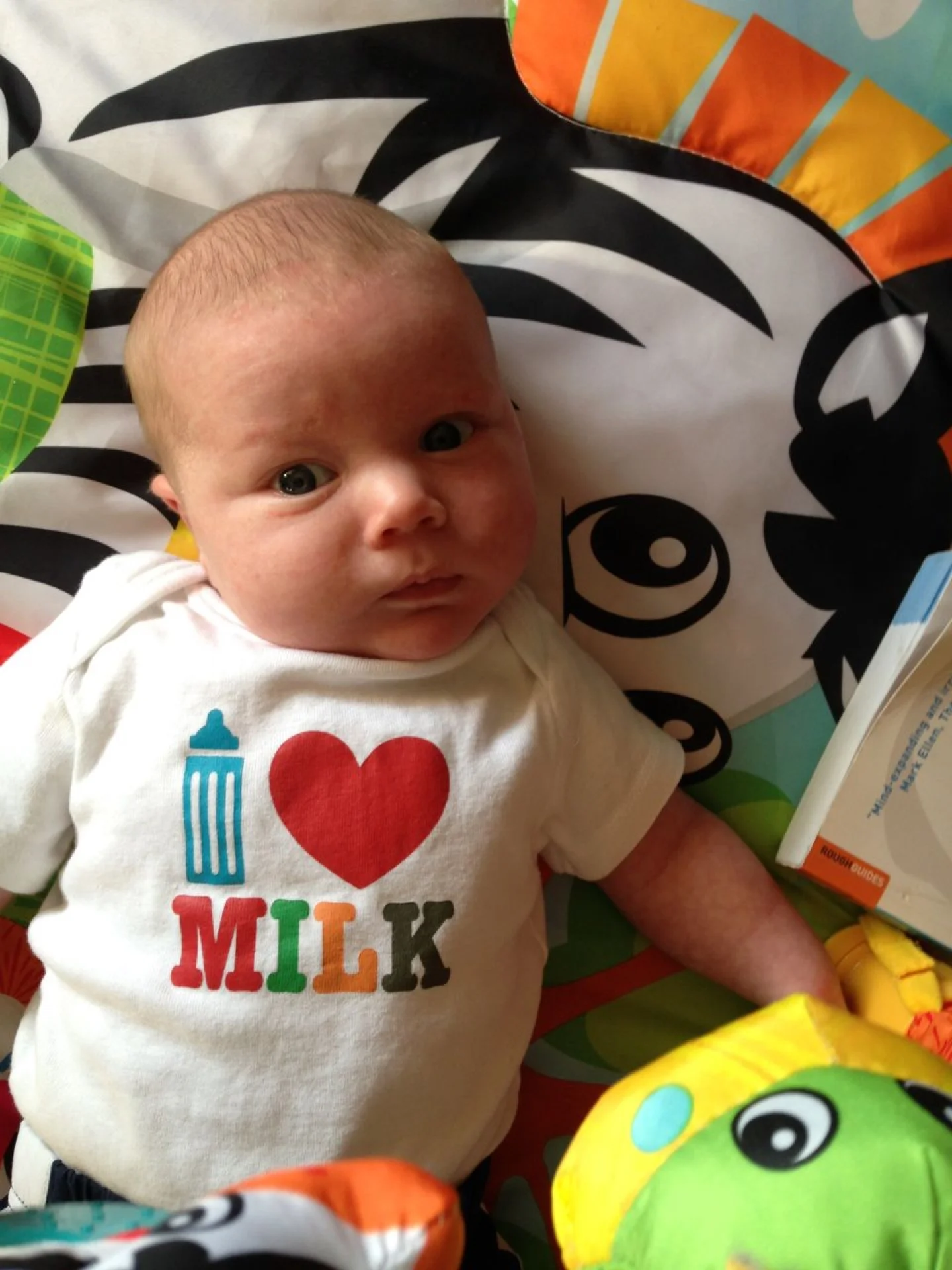 Medical Milestones: Another huge week of developments. Arthur newly found interest in hanging animals is probably due to the bright colors and shapes. He's also very big on following objects and people move around the room. Last night he kept following me flipping his head this way and that as I put away clothes and dishes. And I've seen a ton more eye contact. Most meal times, he stares right at me the entire time.