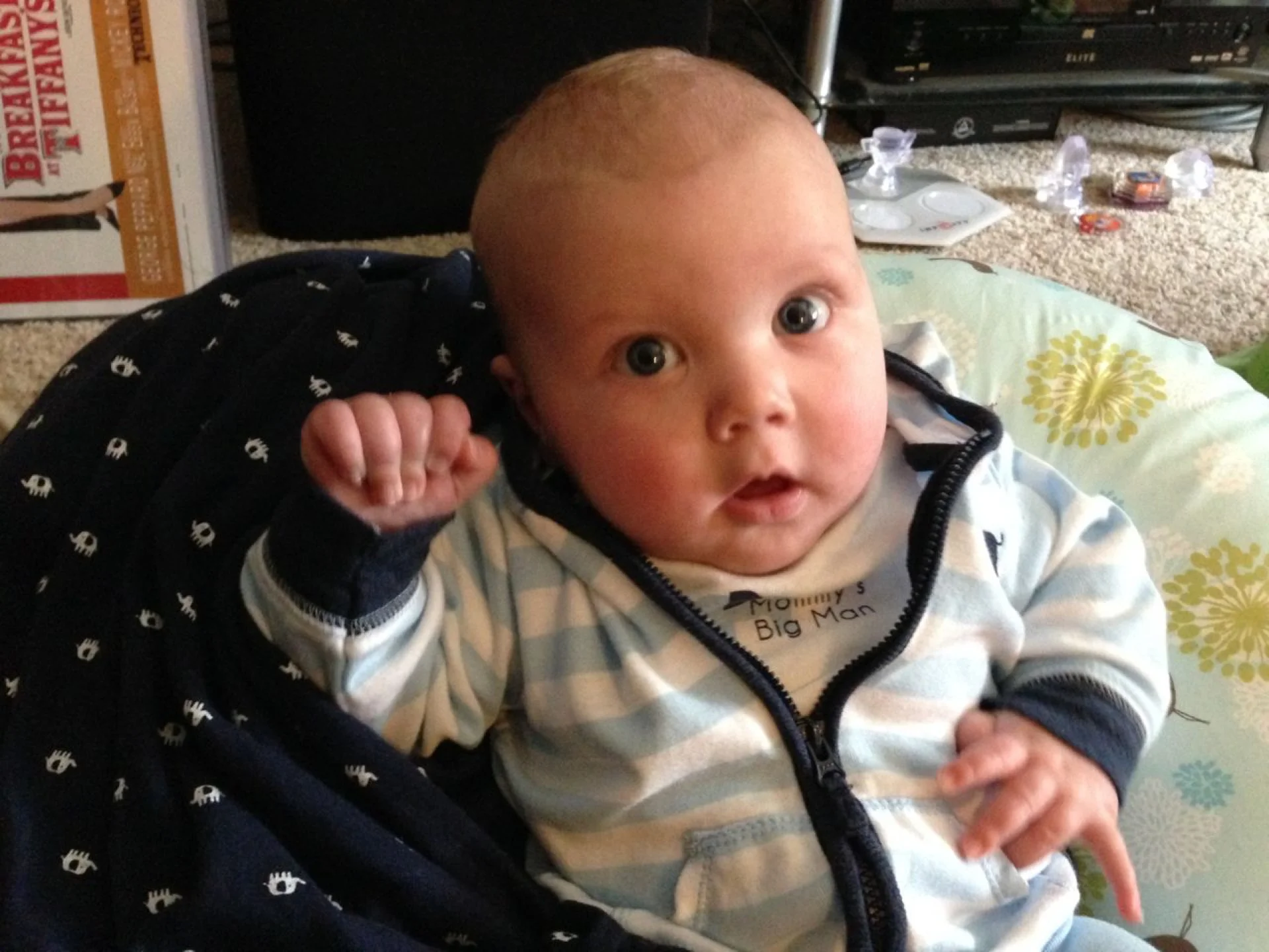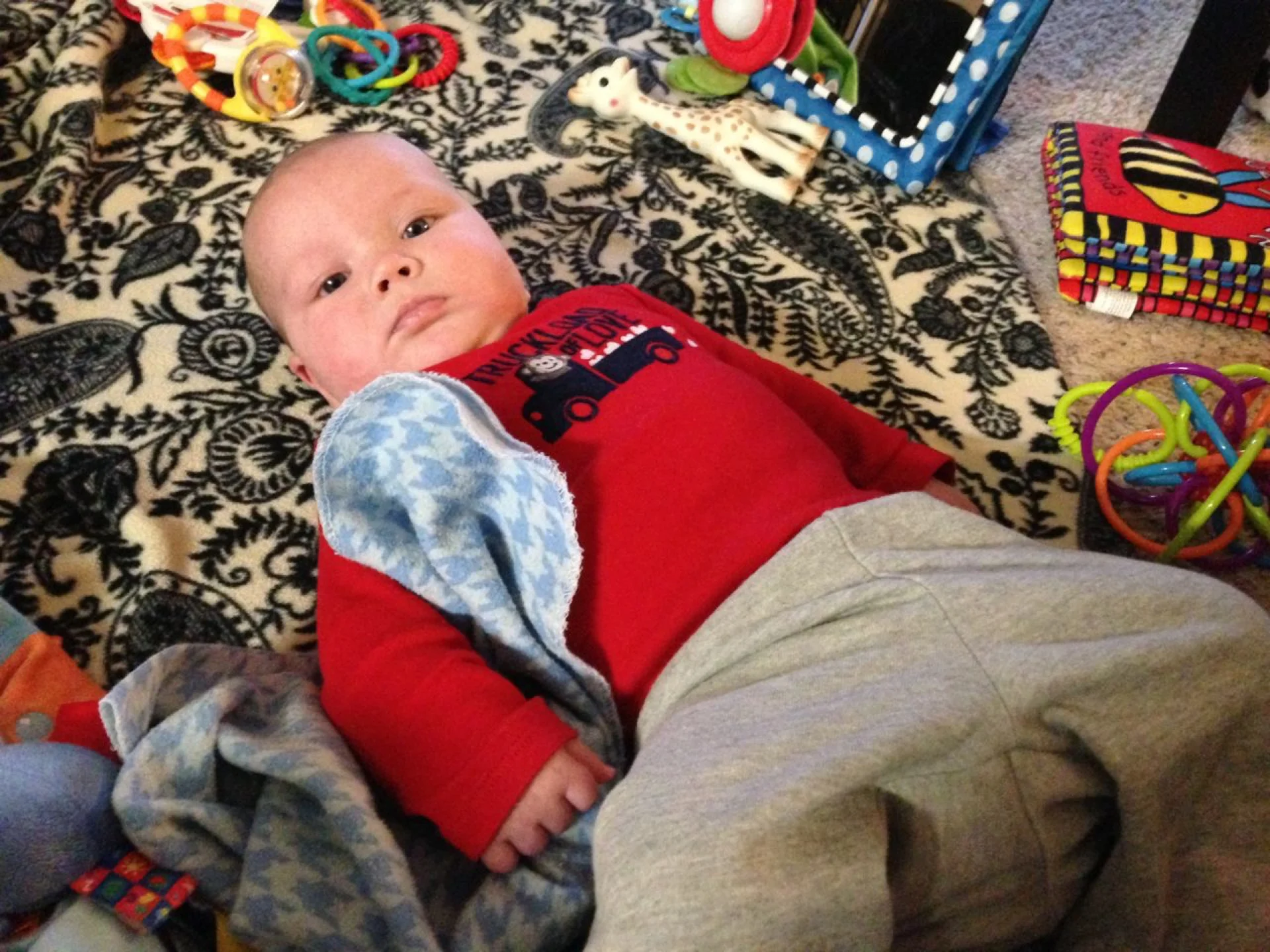 Playing: Loving all the toys. His new favorite one is actually his feet. He can finally grab them and roll around. Yesterday, he even came close to pulling his socks off.