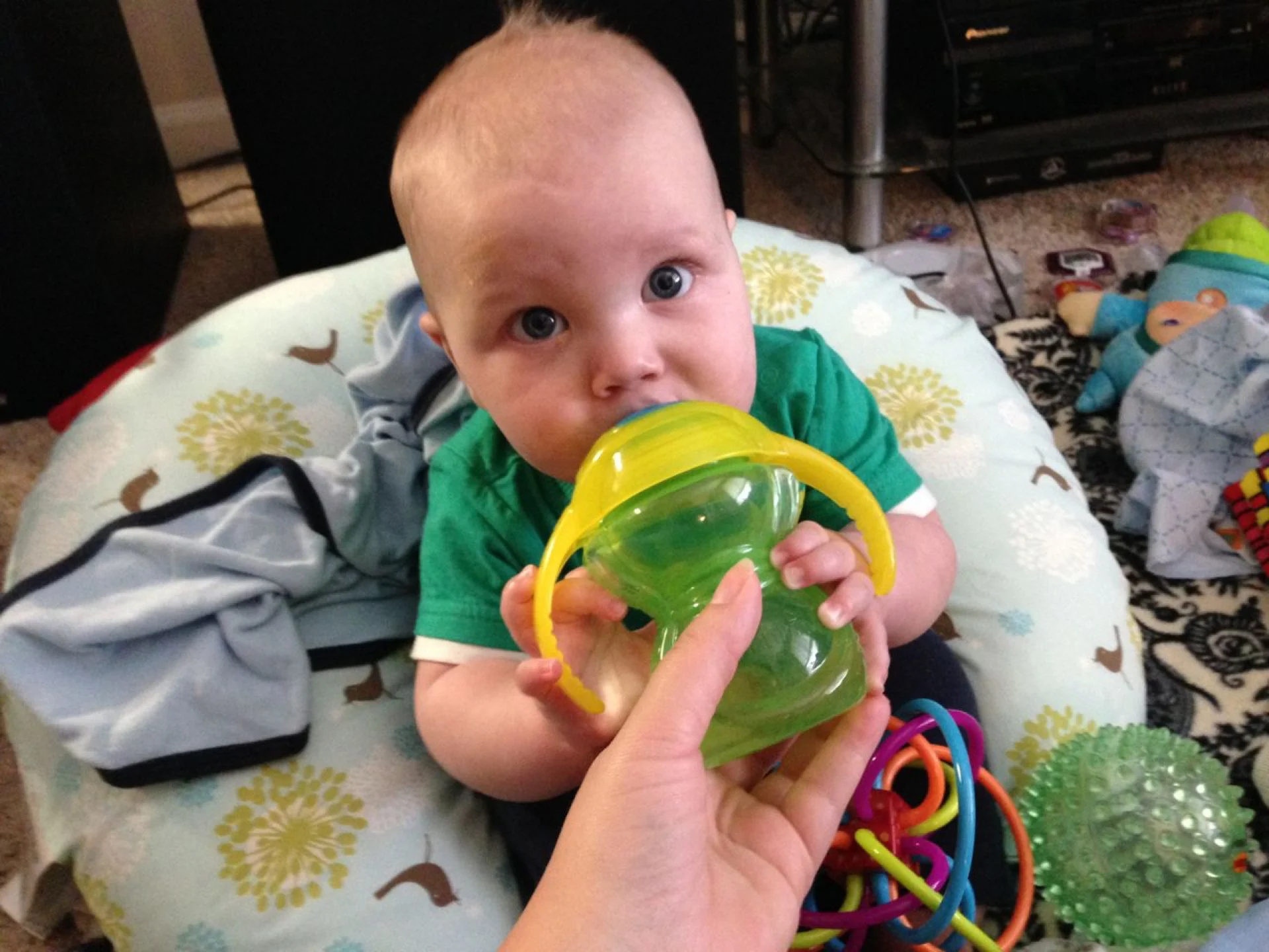 Eating: This past week we branched out to sweet potatoes (which he loves!) and pears. I also introduced real mashed sweet potatoes along with the pureed stuff. I didn't know how he'd react to the texture, but he gobbled it right up. Pears were also a big hit. And he ate one of his vanilla puffs (like Cheerios). We will be attempting green beans and then apples next. My plan is to introduce the pureed either before or with the real mashed food. He still has some gagging issues with the thicker mashed textures of regular veggies, so I don't want to overwhelm him. But the sweet potatoes were a hit. I have high hopes for others. Lastly, I offered him some water in a sippy cup. He played with it for about 10 minutes intermittently attempting to drink it. We'll try again this week.