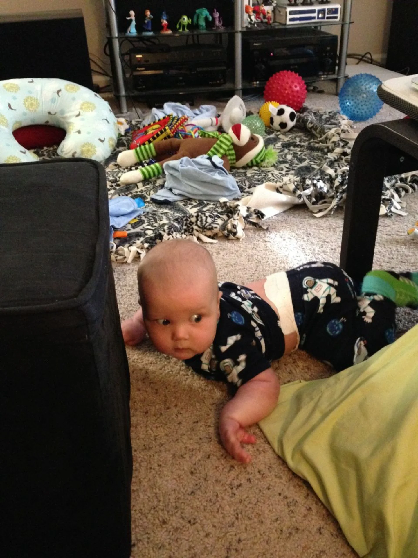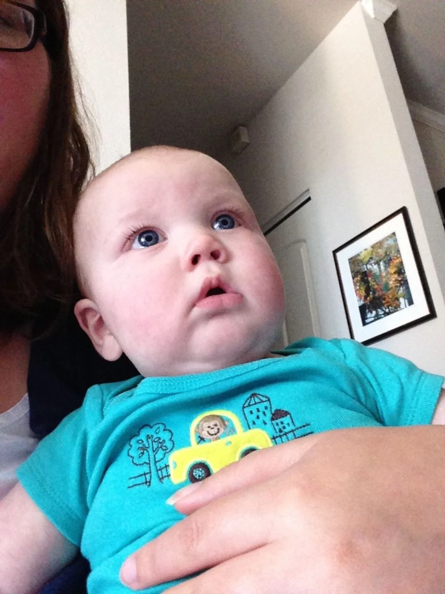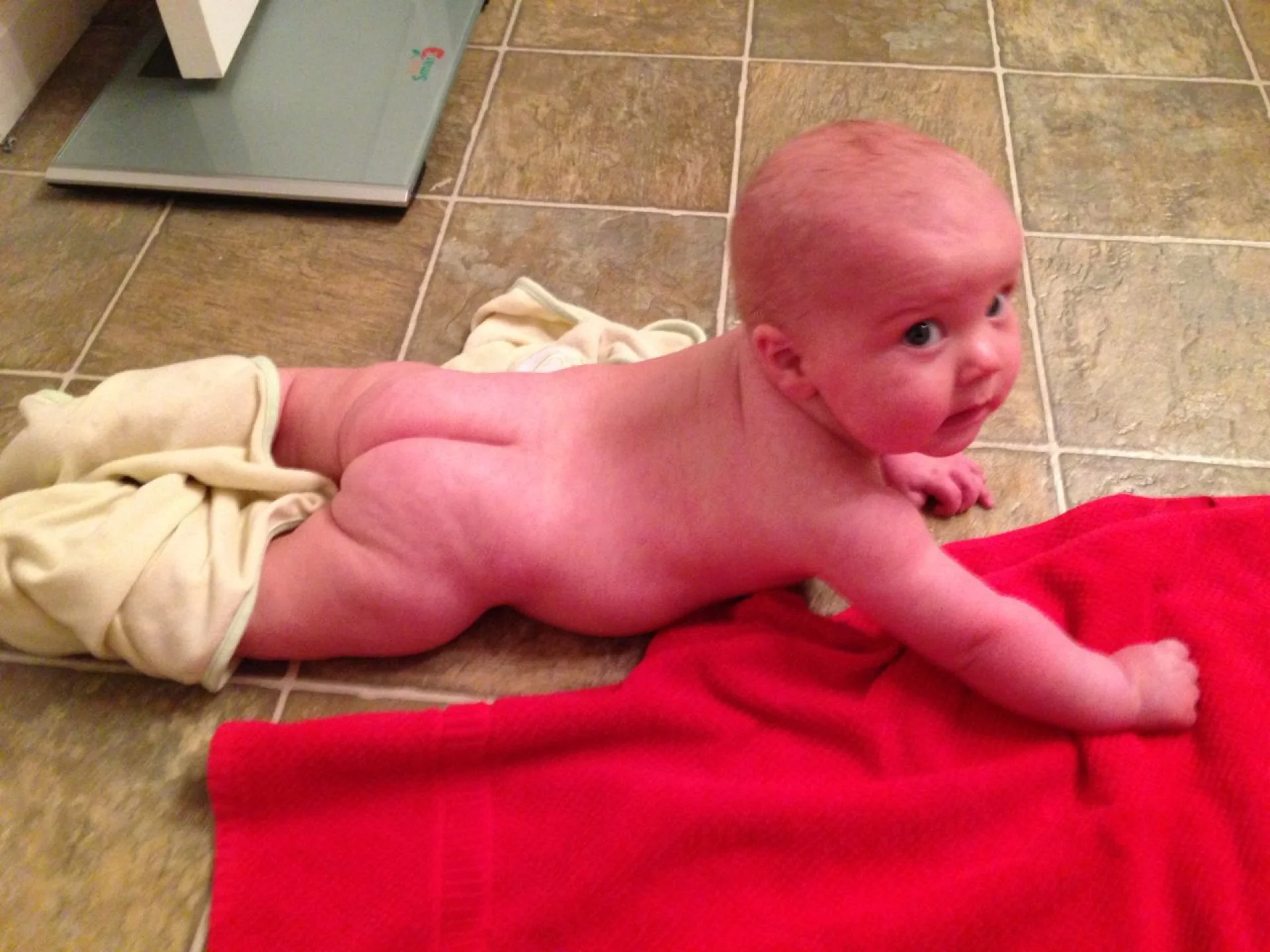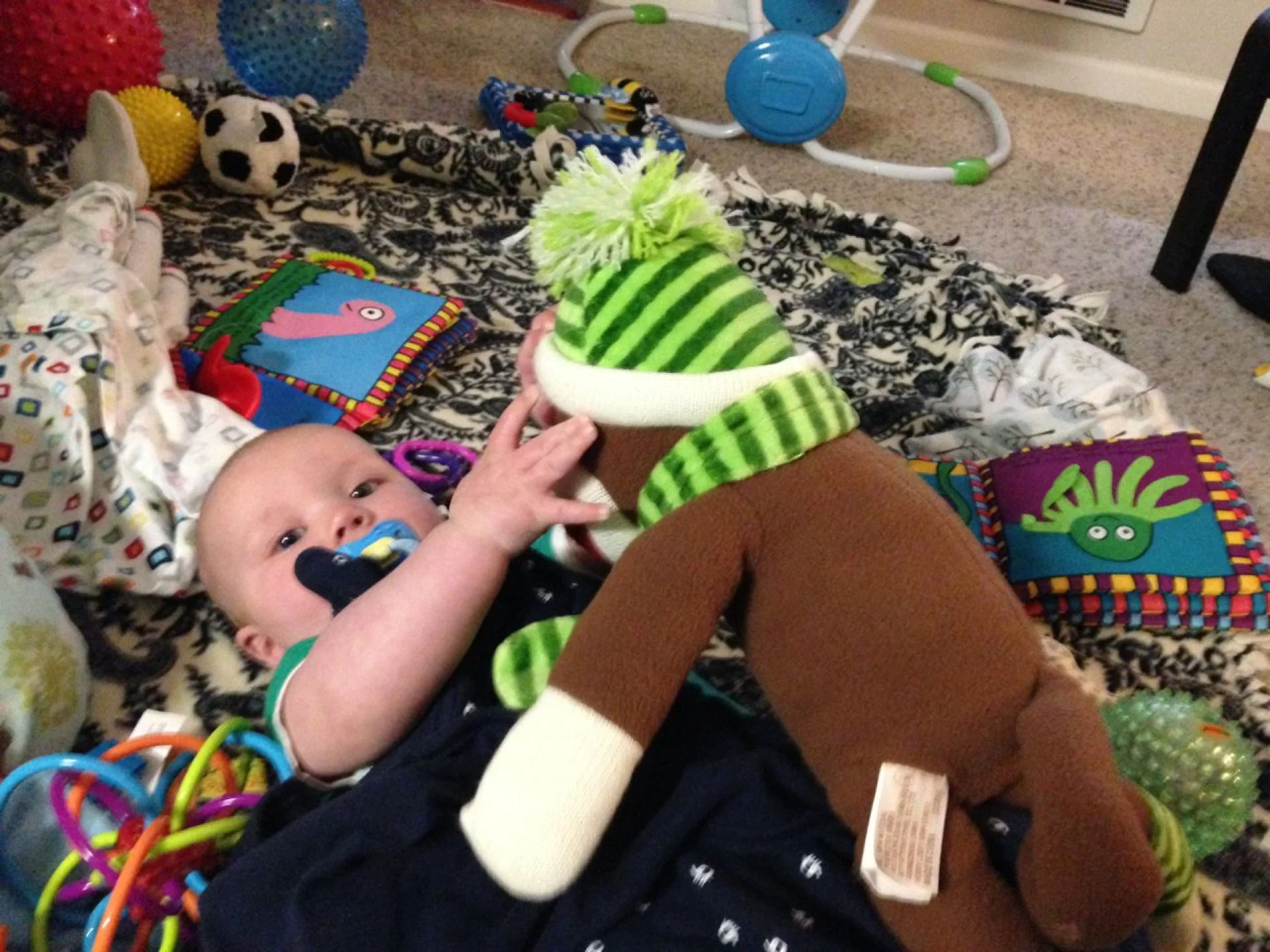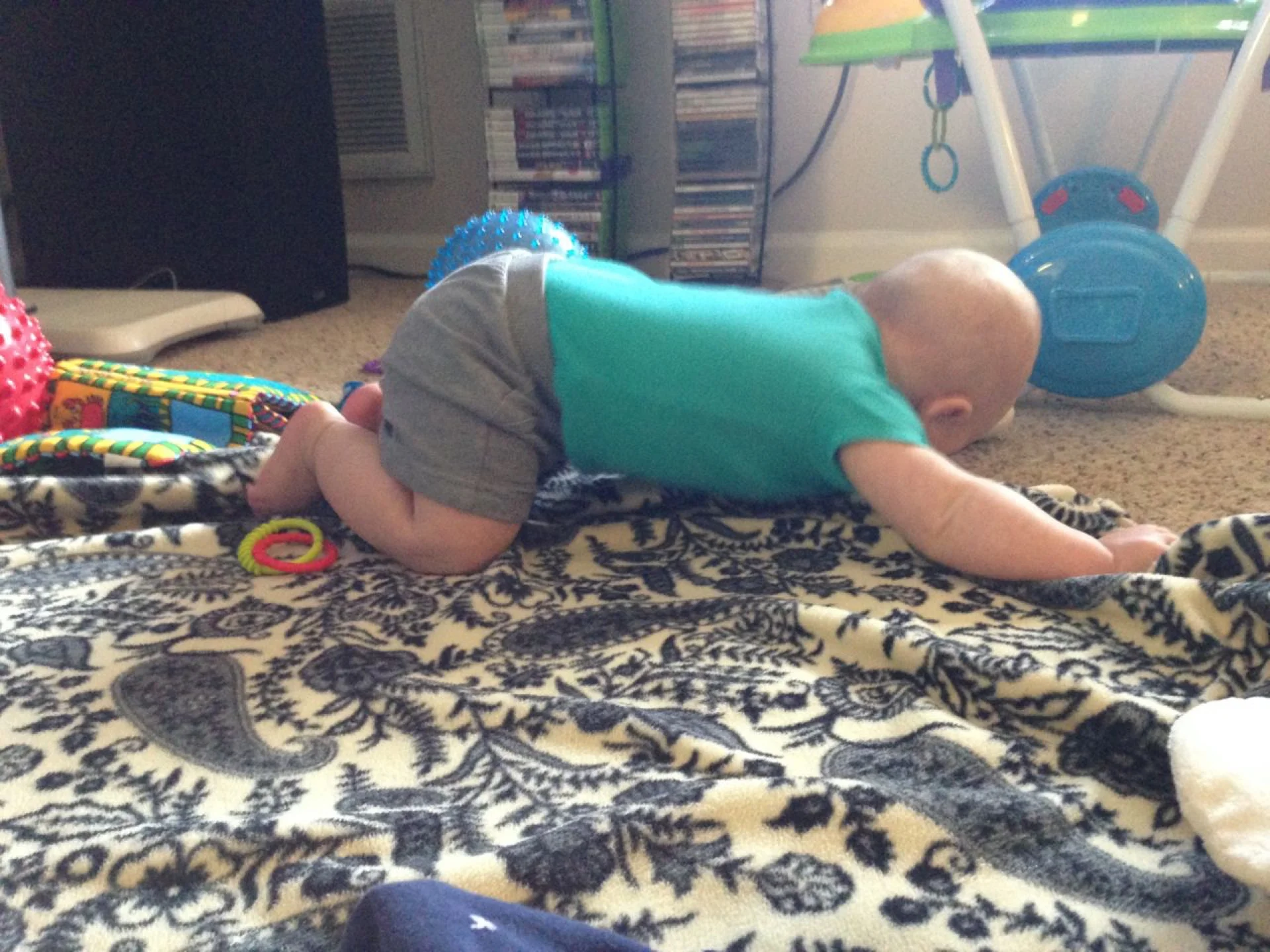 It's been a week of new discoveries (mobility) and trying times (sleep). Almost 5 months old and growing like a weed. He's already wearing 9-12 month clothing. And he's ahead on some of the developmental milestones. I just want him to stay a cuddly little baby a little while longer.