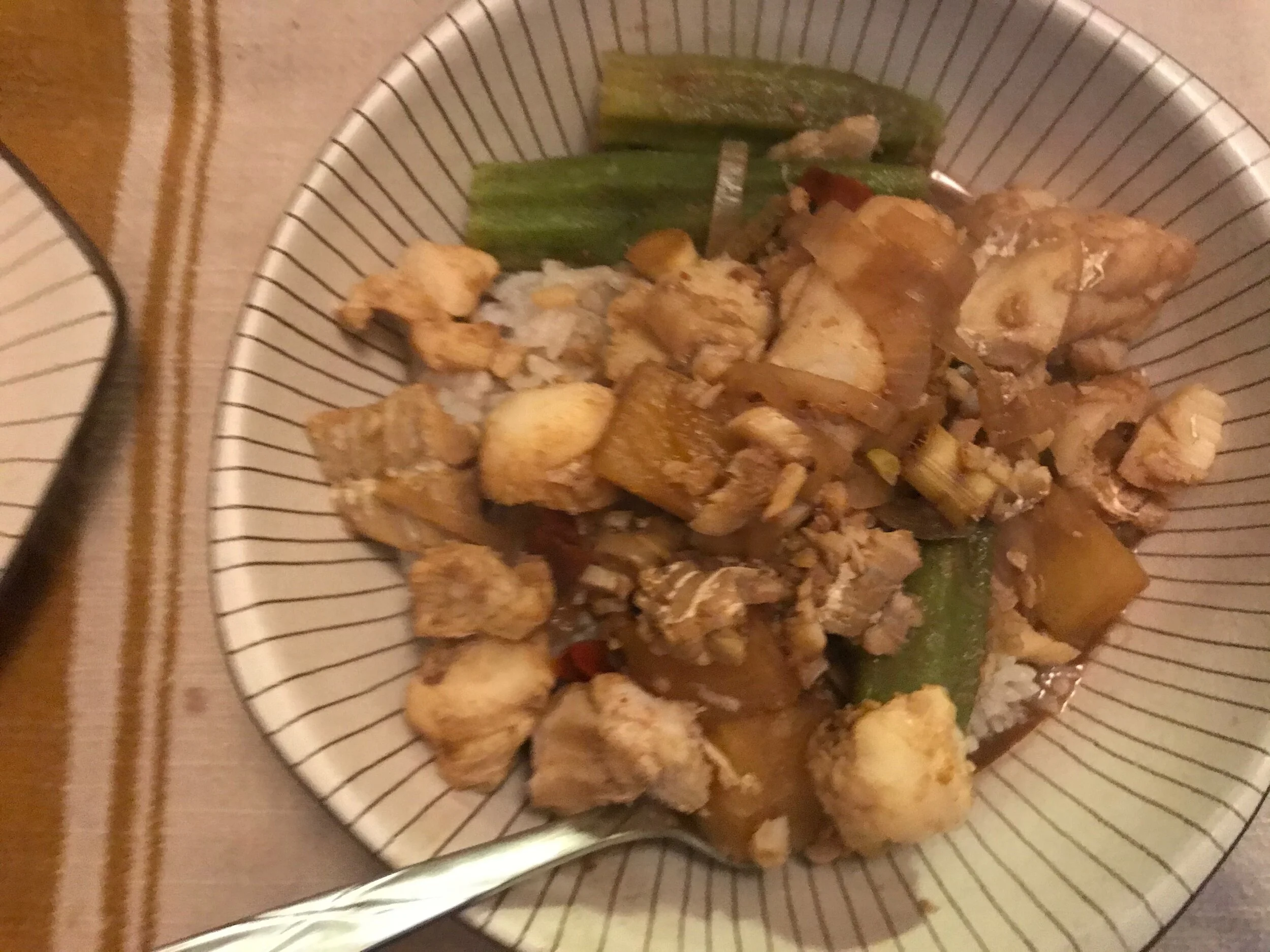 This was very interesting… I loved the flavors but not the complete execution. I definitely want to try making this one again with some minor tweaks. All the ingredients besides the fish needed to be in smaller chunks and maybe simmered longer on the stove before spooning over rice. But it was good and we enjoyed eating it as is.