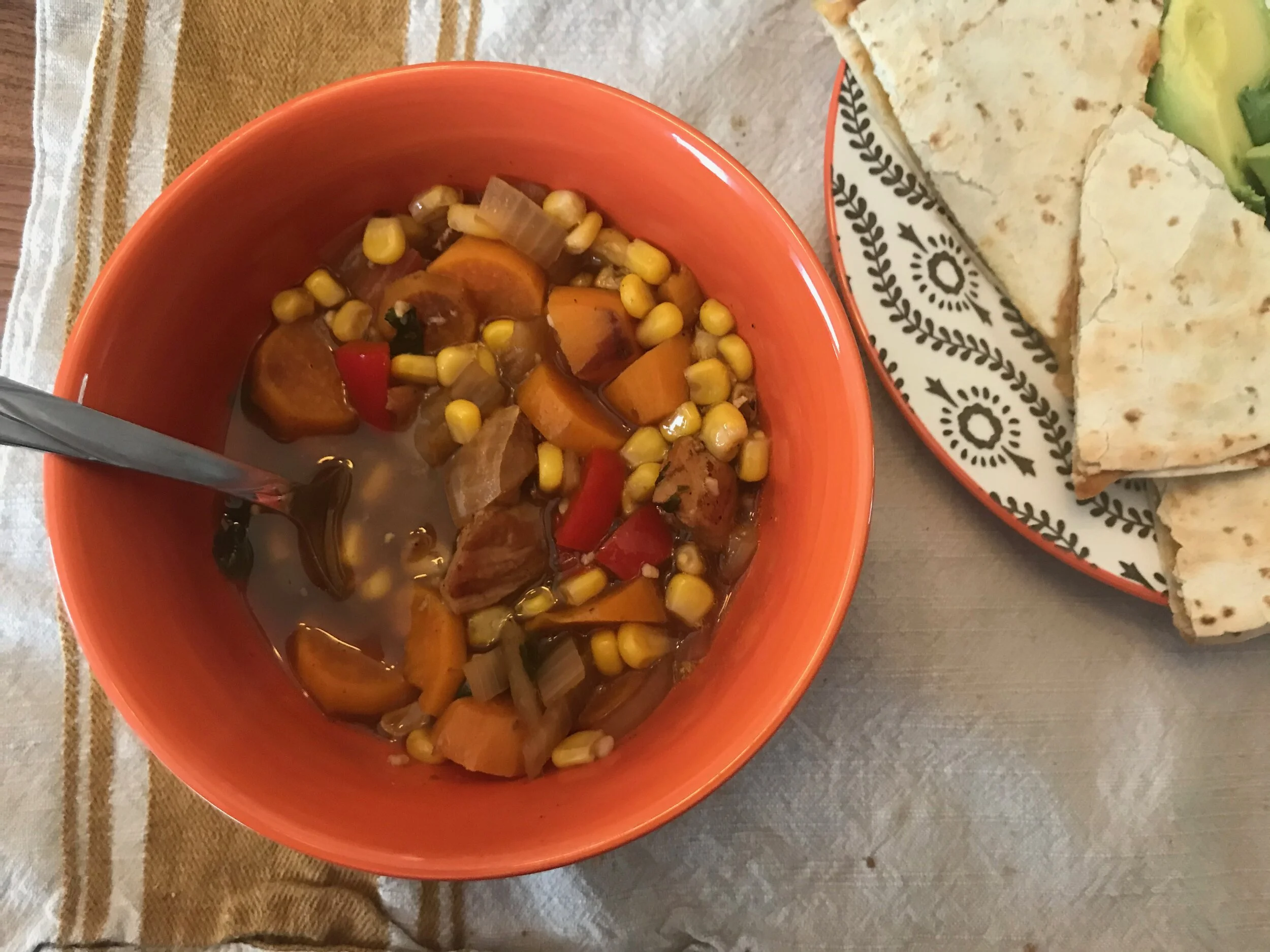 Pretty decent chicken corn chowder. I did have to substitute sweet potatoes for cassava as I could not find any around here.