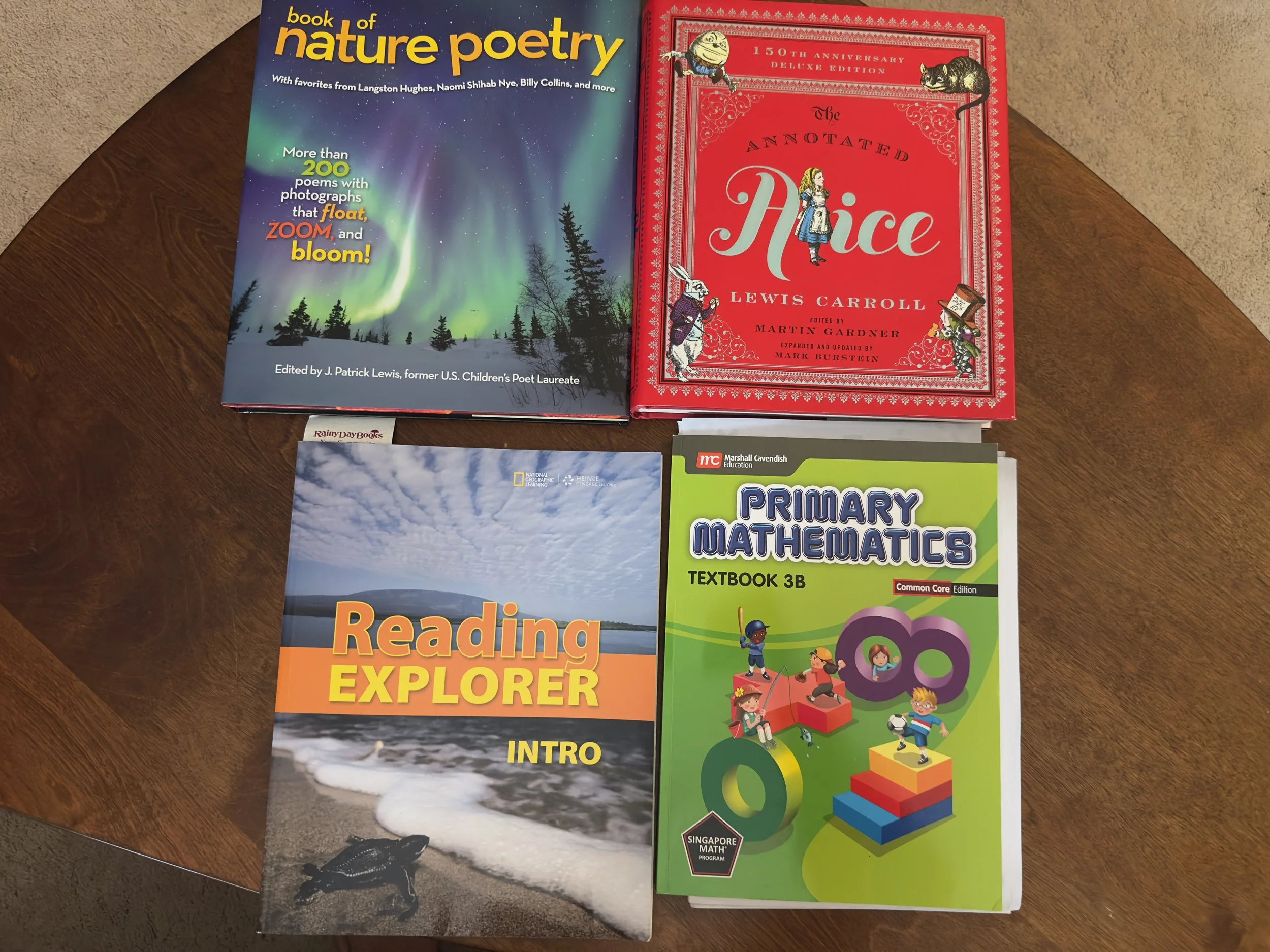 Quentin is primarily using Blossom & Root G3 for his language arts this year. We will pull some elements from Build Your Library Level 3 and random books that we have around the house. We are also starting the Reading Explorer series to focus on reading comprehension and word choice. We continued with Lewis Carroll and started reading the sequel to Alice.