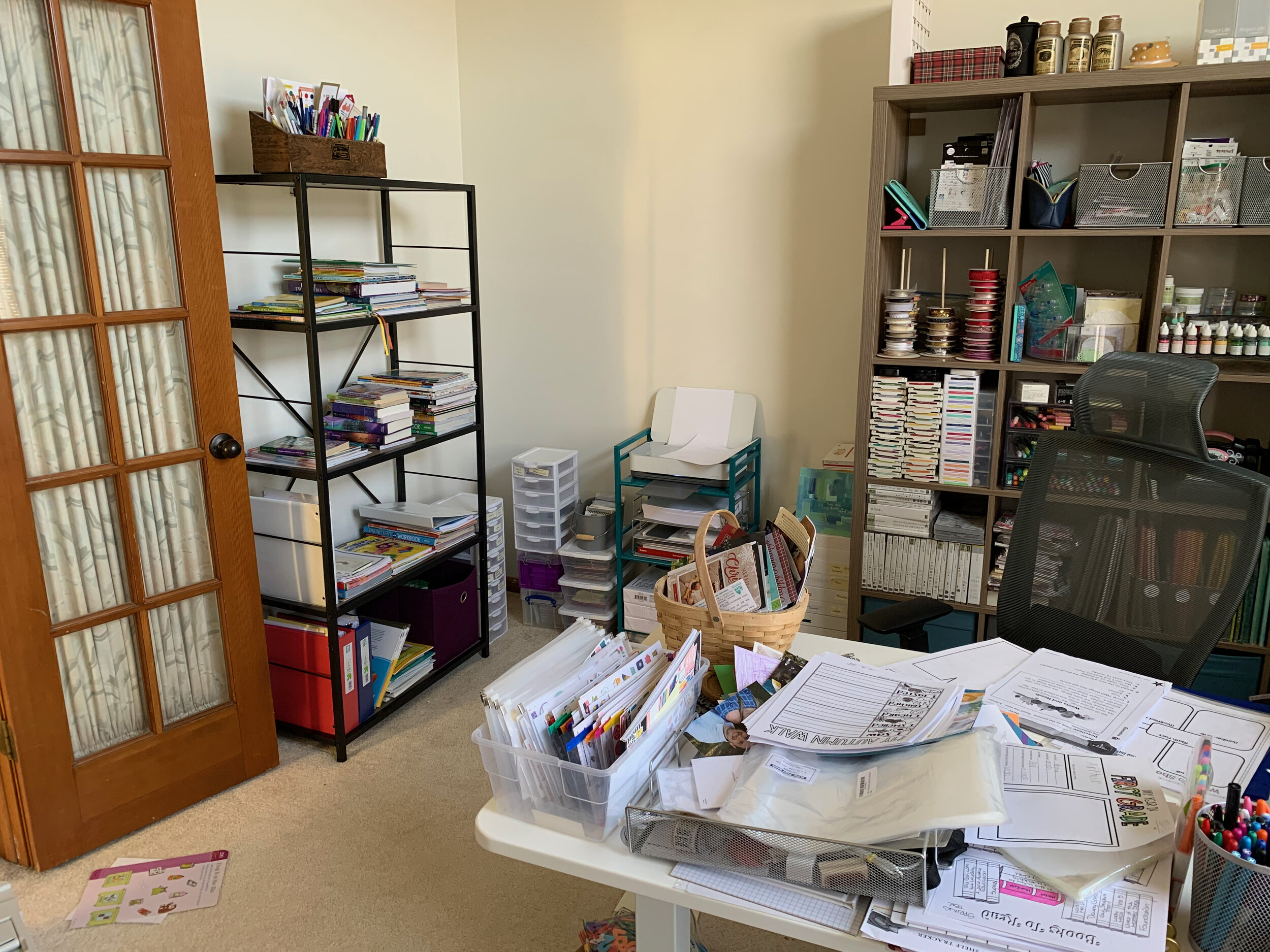 From the camera: I put together a new shelf to hold our homeschooling supplies. My office/craft room is finally coming together. Next step is to clean off the floor.